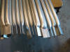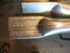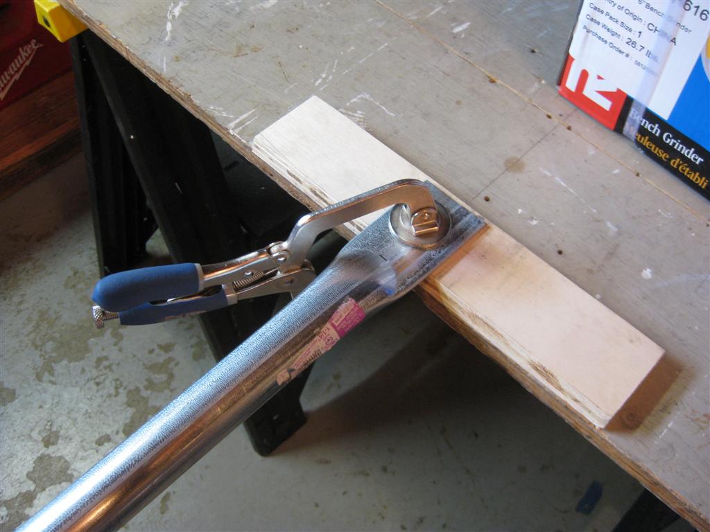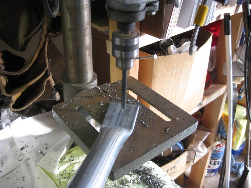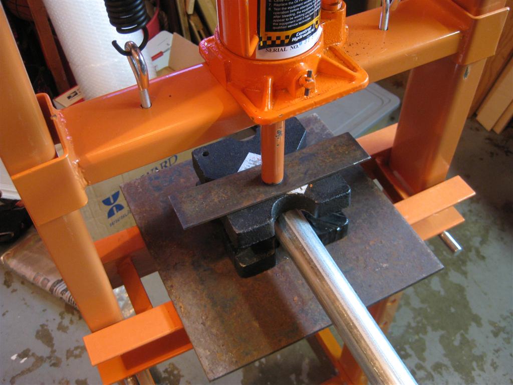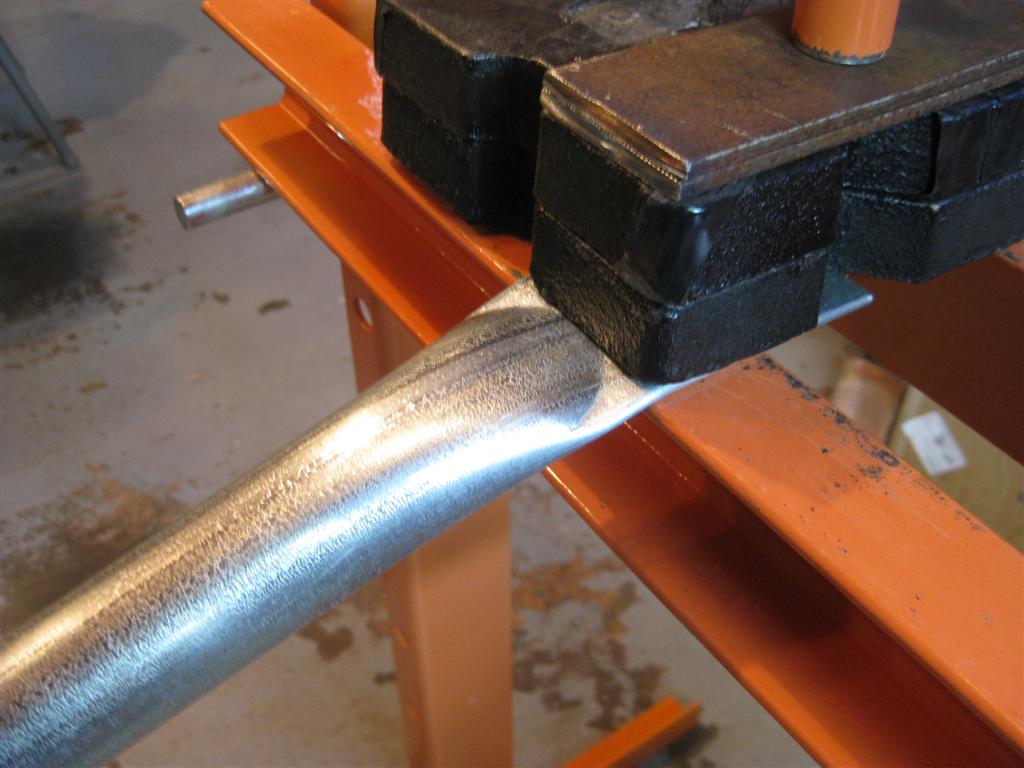 The pictures below show the shop press in action. After flattening one end, the flat end was clamped to a work surface while the other end was flattened. The ends were then bent to the appropriate angles (again using the press) and then drilled with 3/8" holes using the drill press. Finally, the 65 pipes were assembled in a dry run before finishing the struts.
