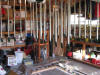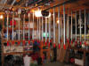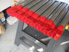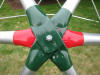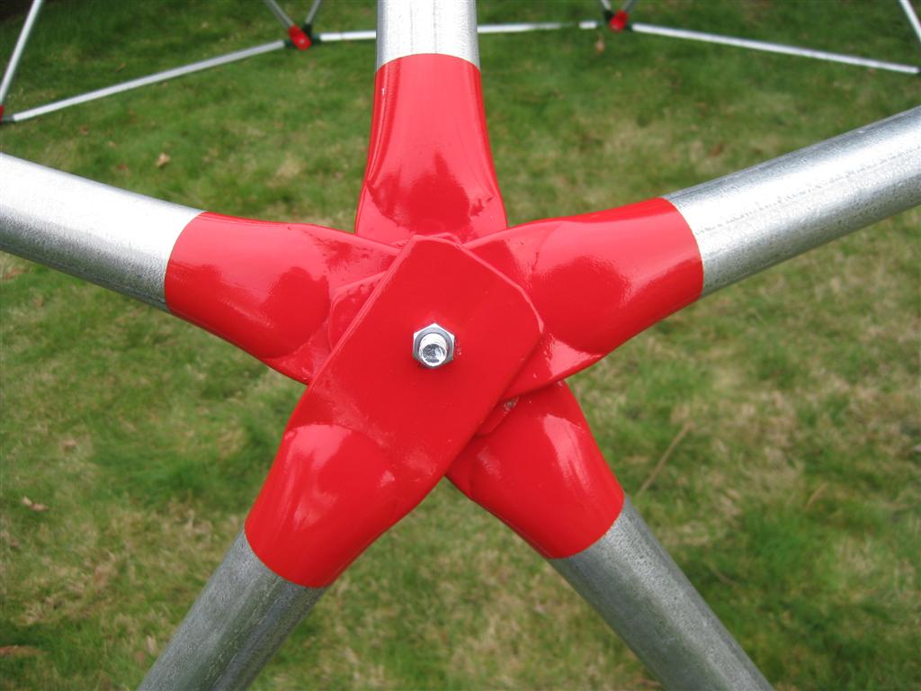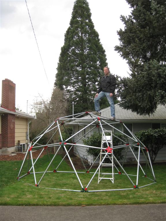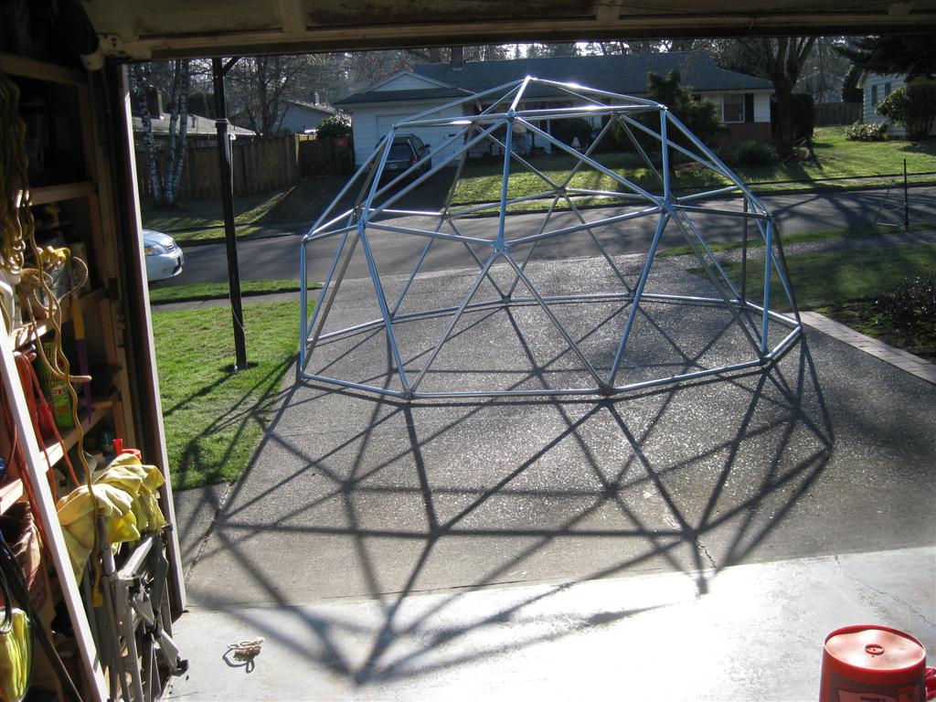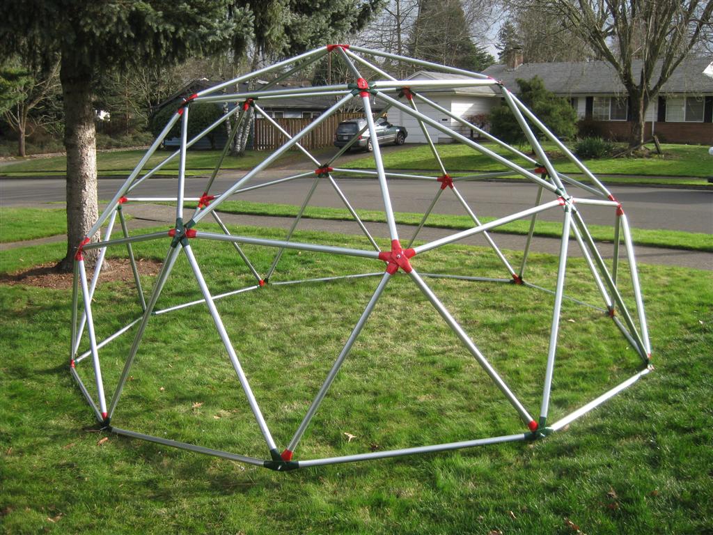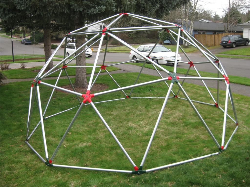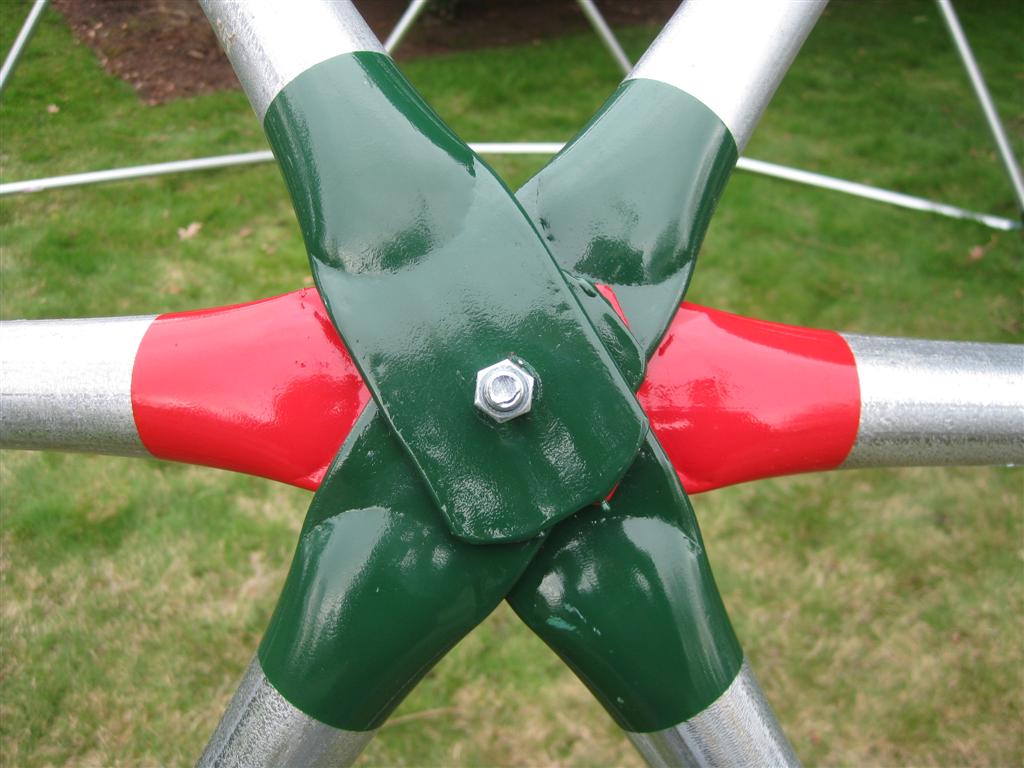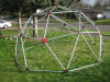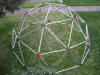 This is a 15' diameter, 2 frequency dome. The dome was made from 1 1/4" EMT. The struts were cut to the 2 required lengths from standard 10' conduit using a metal cutting chop saw with an abrasive blade. The shorter struts were dipped in red paint; the longer ones in green. The ends of the pipes were flattened using a 12 ton shop press.